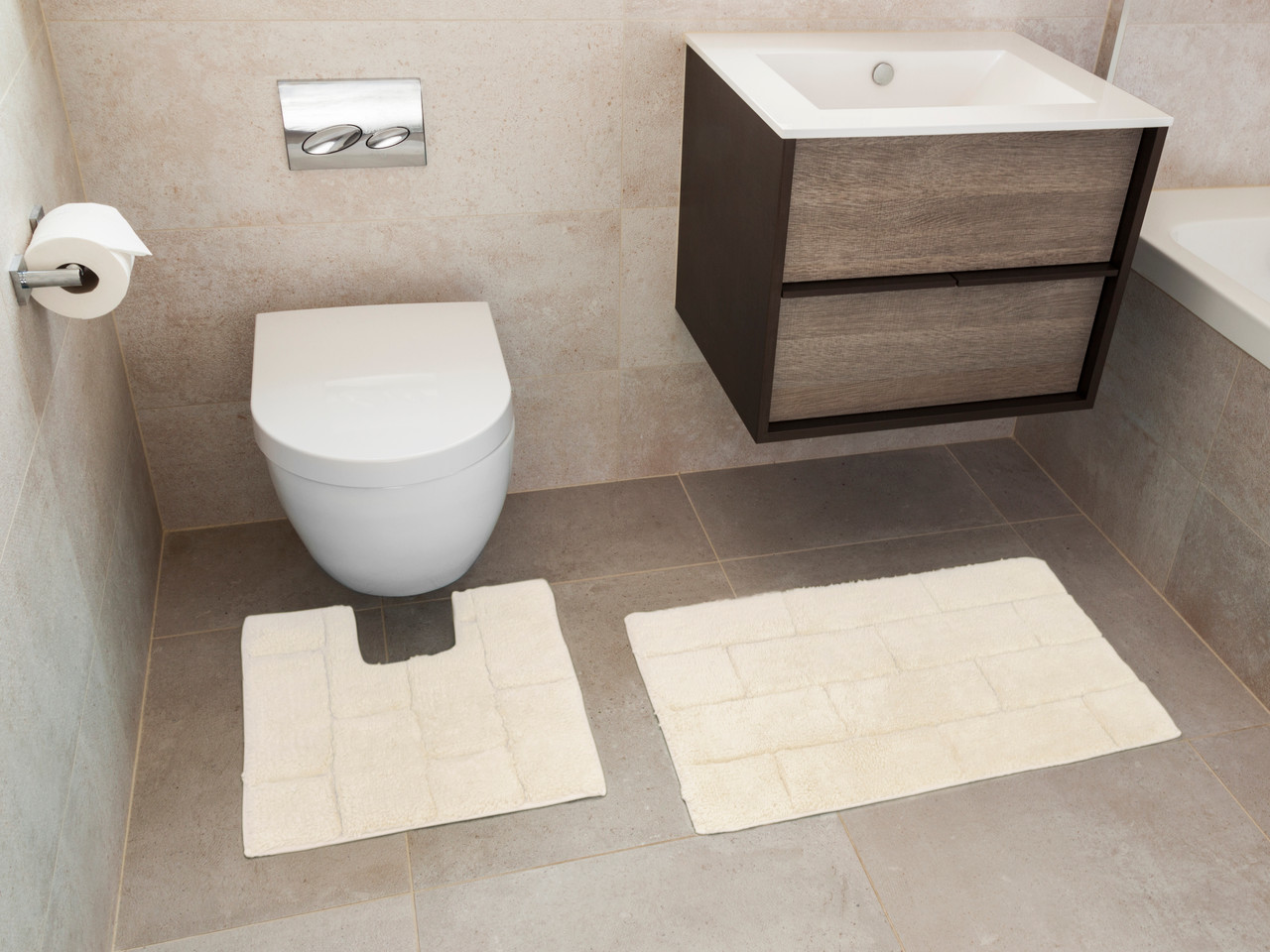 These absorbent and soft-touch tile effect bath mats are made entirely of natural cotton pile. Includes a bath mat and pedestal mat.