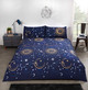 Stunning celestial duvet set featuring an ethereal design of metallic suns and moons on a rich dark background. This design is also fully reversible with an angelic, contrasting ditsy star reverse.