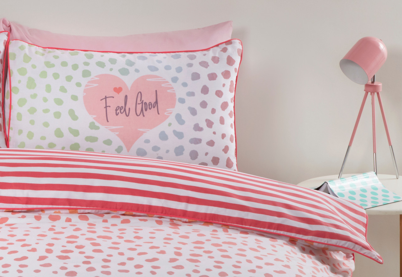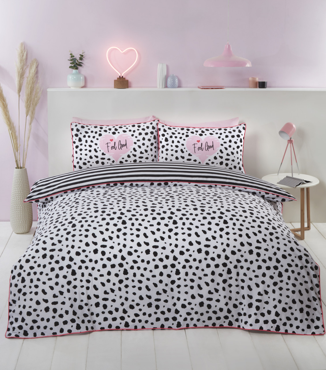 Add a touch of fun colour to your bedroom with this dalmation print duvet cover brought right up to date in contemporary multicoloured ombre tones with a bold pink trim and monochrome tones with a bold pink trim. This eye-catching statement duvet set is sure to brighten any room.