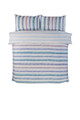 Refresh your bedroom with the Horizon Duvet Cover Set, featuring a calming watercolour stripe design. The subtle yet stylish pattern showcases horizontal brushstroke-effect stripes in soft shades of blue, teal, purple, and warm orange, creating a serene and contemporary aesthetic. This reversible duvet set offers two versatile looks—one side features bold, colorful stripes, while the reverse presents a lighter, minimalist version with delicate blue lines on a white background.