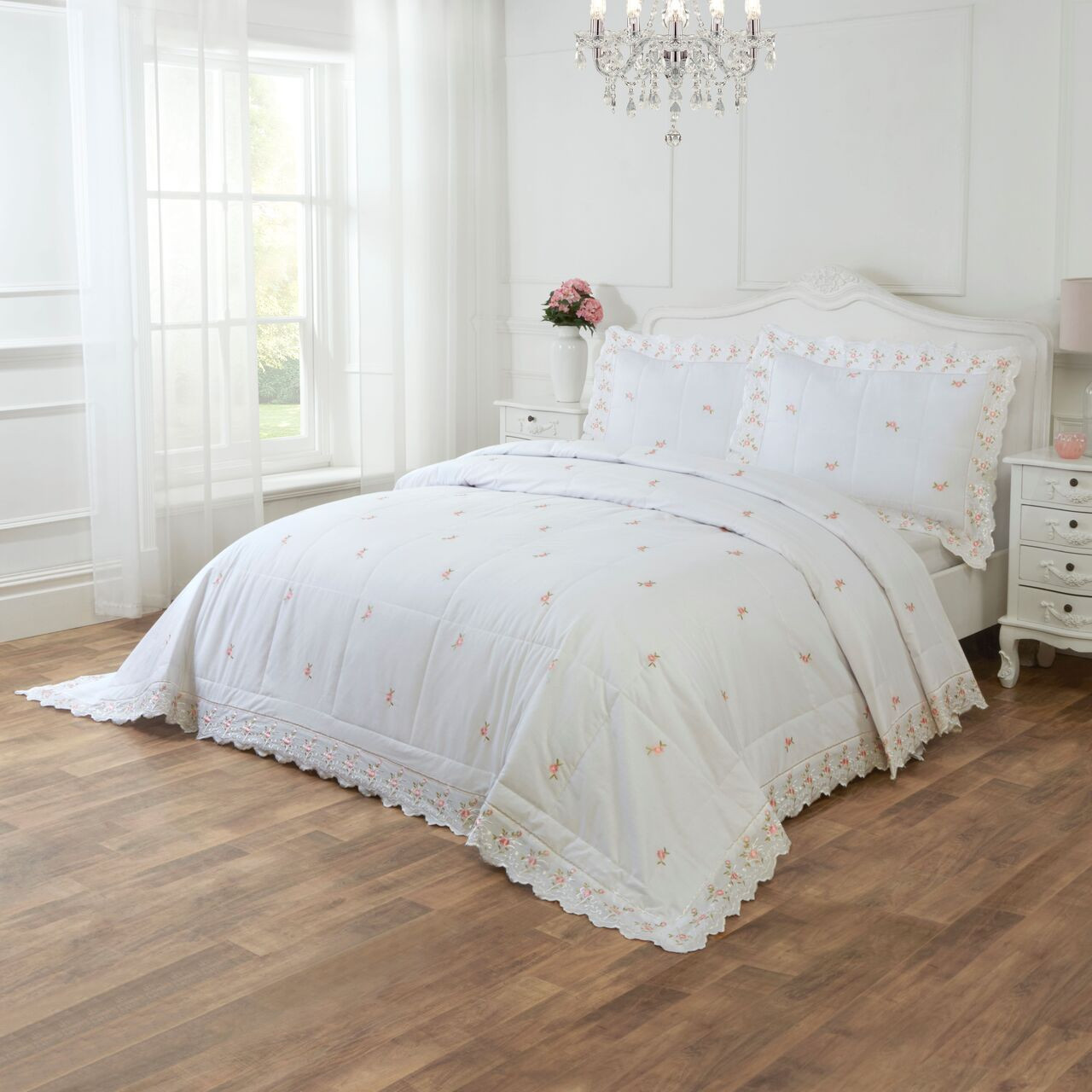 Our delicate sophie design features embroidered roses throughout on a cream or white base with broiderie anglaise lace trim to the duvet cover.